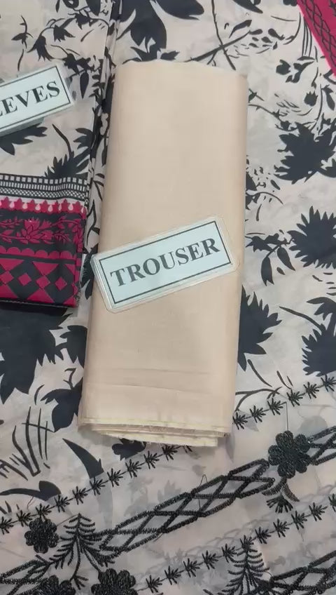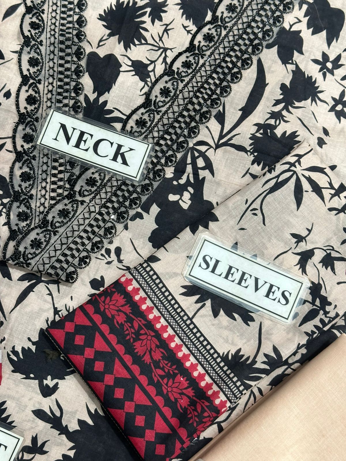 A premium designer-inspired unstitched 3-piece lawn suit featuring an embroidered neck and daman. The printed lawn shirt is paired with a soft printed dupatta and plain lawn trouser, creating a fresh and elegant summer look.